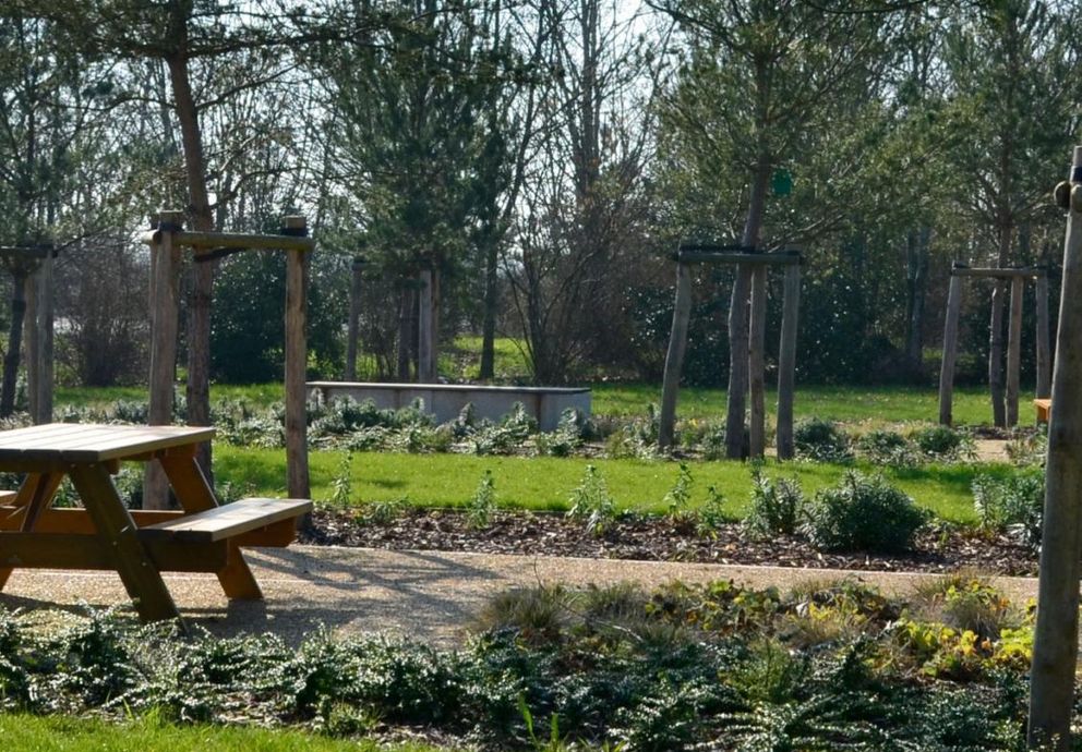 Traversez le jardin via l’allée principale, et accédez ensuite à la pinède. Ici, il flotte une ambiance de forêt d’arrière-dune. Les pins ordonnés sur une trame régulière surplombent des lignes de graminées et de végétaux persistants, comme dans un sous-bois réinterprété. Cette pinède s’étend sur 4 rectangles. Le premier d’entre eux intègre les jeux pour enfants, bien visibles depuis la pelouse. Dans les autres rectangles, des tables de pique-nique prennent place au milieu des plantations. Chacune est reliée à un chemin secondaire qui s’étend vers le parking en traversant des dunes. Admirez ces étendues qui prennent place de part et d’autre de la route. Accessibles depuis l’espace pique-nique, elles sont traversées par plusieurs chemins et sont recouvertes de sable. Selon la saison, vous pourrez même apercevoir des oyats, ces plantes caractéristiques des dunes et des bords de mer. Sentez-vous cet avant-goût de plage et de mer sur votre trajet ?